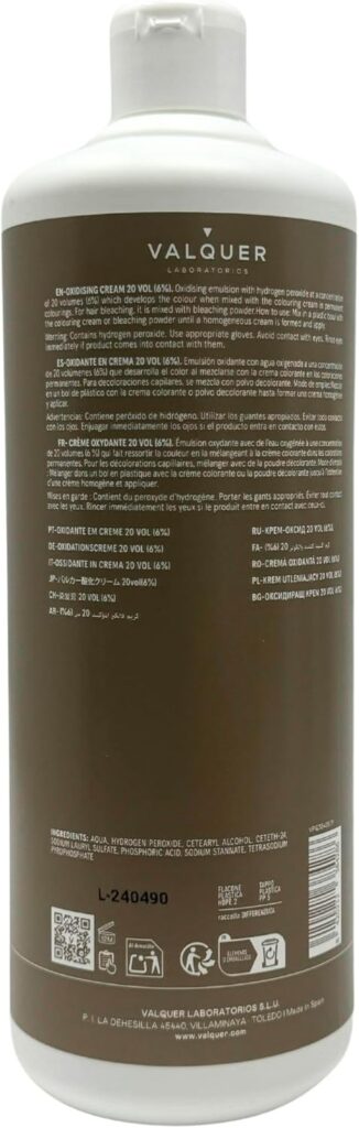 Emulsión oxidante formulada con agua oxigenada de 20 volúmenes, Concentración 6%.